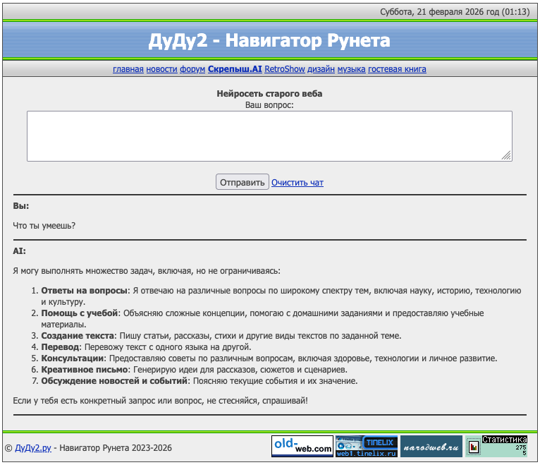 Ради эксперимента сделал простенький сайтик, где можно пообщаться с нейронкой из старого браузера. Проверено в IE6