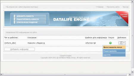Вложение 256 Движок очень шустрый, но есть 1 проблема с которой вы столкнетесь после установки данной версии DLE. После установки ваш сайт будет безбожно тормозить из-за включенного RSS информера, который пытается парсить несуществующий RSS канал Яндекса. Раньше он выводил новости оттуда в боковой панели сайта. Поэтому после установки не заходим на сайт, а вместо этого сразу заходим в адмику admin.php, выбираем "Список всех разделов" в верхнем левом меню, под "Редактировать все новости". Находим в самом низу "RSS информер на сайте". Заходим и останавливаем или удаляем "Новости с Яндекса". Только после этого вы можете пользоваться этим движком без проблем. Советую не использовать слишком свежии версии PHP. Вложение 257 Теперь можно скачать и попробовать этот движок в действии. Ссылка: https://cloud.mail.ru/public/w1qS/kf5Z2jUvP Пароль: scripter.biz |