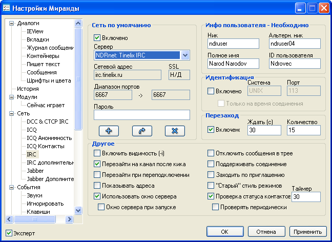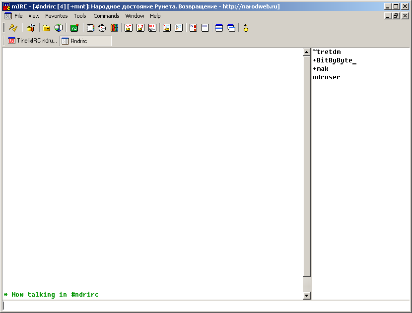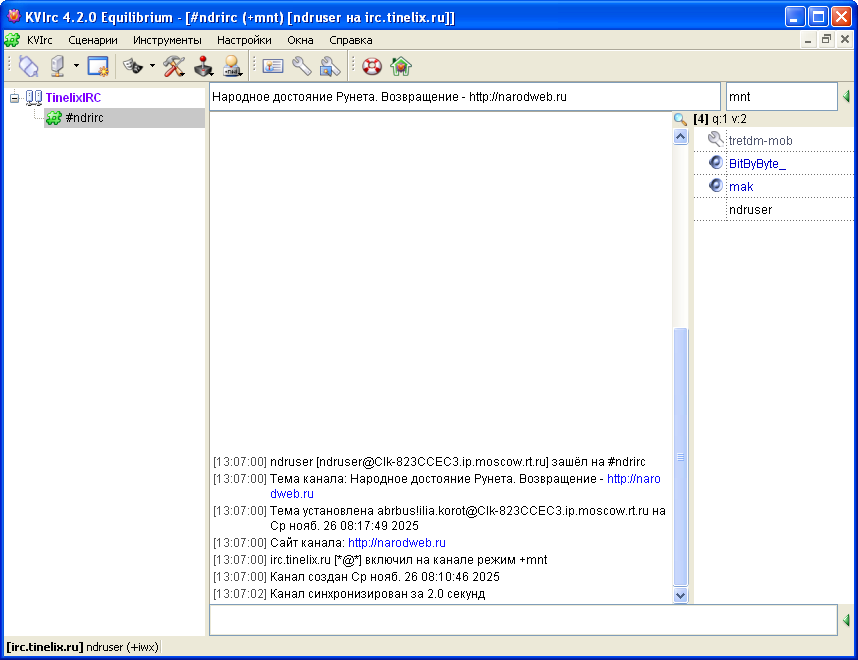 Преимущества IRC: 1. IRC клиенты доступны для любых устройств и операционных систем, начиная с MS-DOS и заканчивая Windows 11, а также Linux-дистрибутивами и Mac OS. Вы можете общаться как с модного "игрового" ноутбука, так и с Pentium 1-2, а также 386-486. 2. IRC клиенты экономны и минималистичны. Вы можете общаться даже со слабой скоростью интернета, даже выходя через dial-up или ADSL модем. 3. Здесь вам гарантирована анонимность ваших переписок, контроль за IRC каналом осуществляет его оператор (администратор). IRC децентрализован, то есть не имеет четкого управления со стороны различных корпораций. 4. Конечно же, атмосфера. Отсюда, думаю, вы не уйдете равнодушным, так как обсуждаем разные темы. :) Дополнение к пункту № 4: в IRC канале вы можете обсуждать разные темы, не ограничиваясь одним лишь даунгрейдом. При обсуждении политических тем лучше избегайте резких/радикальных/оскорбительных высказываний в адрес разных государств и национальностей. Дополнение от 08.12.2025: канал находится в IRC-сети, созданной нашим другом Дмитрием Третьяковым (aka tretdm, tinelix), так что руководствуемся правилами, установленными на его сервере :) IRC клиент для вашего Nokia, Sony Ericsson или Siemens скачайте здесь. Для Android качайте клиент IRC for Android. Для Mac OS и iOS рекомендуем Adium и IRCCloud. Если ваш клиент имеет поддержку графических смайлов, не злоупотребляйте ими - не все поймут ваше послание по причине возможного отсутствия поддержки графики у остальных членов сообщества. Используйте текстовые смайлы (также можете использовать каомодзи). Если в вашем клиенте в настройках сервера включена по умолчанию поддержка шифрования SSL - выключите ее. Список базовых IRC команд и список операторов канала Здесь мы вам покажем, как настроить IRC клиент на примере известного в различных сообществах mIRC. Также рекомендуем и KVIRC. Также НДР рекомендует вам использовать сборку клиента Miranda IM, созданную администратором Ильёй (aka abrbus) специально для нашего проекта. Первым делом скачайте и установите любой из этих клиентов: mIRC 6.15 (для Windows 3.x), KVIRC 4.2.0, Miranda IM. Пункт для mIRC: 1. После установки вы увидите вот такое окно, затем нажимаем "Настройки" (вторая кнопка слева): Вложение 290 2. Вводим свое имя (если хотите), ник: Вложение 291 3. Открываем раздел "Servers" (Сервера) и нажимаем "Add" Вложение 292 4. Вводим адрес сервера и порт Вложение 293 5. Нажимаем "Connect to server" Вложение 294 6. Видим список каналов для подключения, затем нажимаем "Add": Вложение 295 7. Вводим название нужного вам канала и нажимаем OK. Вложение 296 8. Подключаемся (нажимаем Join) и общаемся. Вложение 297 Пункт для KVIRC: 1. После установки мы видим следующую картину. Нажимаем "Дальше": Вложение 298 2. Принимаем лицензионное соглашение. Вложение 299 3. Указываем директорию, в которой будут храниться настройки клиента. Вложение 300 4. Указываем свой ник и любую информацию о себе. Вложение 301 5. Выбираем тему оформления. Вложение 302 6. Вы можете сделать KVIRC клиентом по умолчанию, если необходимо. Вложение 303 7. Нажимаем указанную на скриншоте кнопку "Новая сеть" и вводим название. Нажимаем "Дополнительно". Вложение 304 8. Во вкладке "Идентификация" вводим имя и ник. Вложение 305 ВАЖНО! 9. Во вкладке "Соединение" порт меняем на 6667 и кодировку на CP-1251. Вложение 306 10. Вводим в первую строку название нужного вам канала (в нашем случае - #ndrirc) и нажимаем "Добавить". Вложение 307 11. Нажимаем OK и подключаемся. Приятного вам общения! Вложение 308 Пункт для Miranda IM: Скач